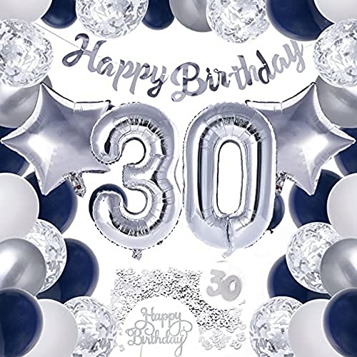 38 pezzi di decorazioni di compleanno: il pacchetto include palloncini blu navy da 12 pollici (10), palloncini bianchi da 12 pollici (5), palloncini argento metallizzato da 12 pollici (5), palloncini glitter argento da 12 pollici (5), palloncini blu navy da 5 pollici (5 ), 32 palloncini in alluminio numero 30 (2 pezzi, 1 set), palloncini a stella da 18 pollici (2), banner di buon compleanno (1), decorazioni per la tavola numero 30 (1), topper per torta di buon compleanno (1), punti di colla (1)