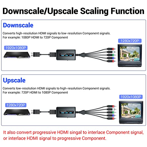 FUNZIONE DOWNSCALE/UPSCALE SCALING - Questo convertitore da HDMI a YPbPr può convertire il segnale HDMI Full HD in una risoluzione inferiore dei segnali Component, come 1980x1080P HDMI a 1280x720P Component (downscaler), può anche convertire una bassa risoluzione del segnale HDMI in una risoluzione maggiore di Segnale componente, come 1280x720P HDMI a 1920x1080P Component (di alto livello).