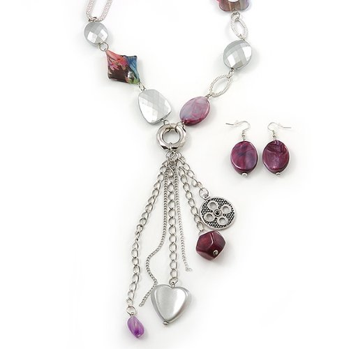 Parure composta da collana lunga e orecchini, con pepite di resina viola e pendenti, nelle tonalità dell'argento, della lunghezza di 78 cm (con estensioni di 5 cm)