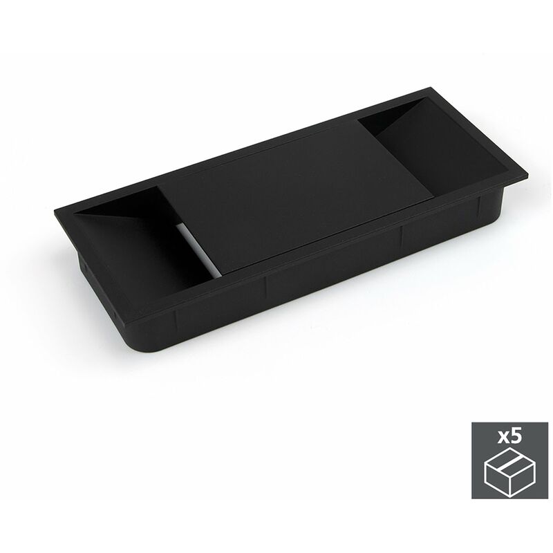 Passacavi Da Tavolo Rettangolare 152 X 61 mm Da Incasso Plastica Nero 5 Pezzi Emuca Passacavi da integrare in qualsiasi scrivania da ufficio o tavolo, in plastica. Ideale per nascondere le connessioni in modo facile Passacavi rettangolare da incasso nella superficie del mobile. Nasconde i cavi degli apparati elettronici nella scrivania, piani da lavoro o mobili per la Casa. Il coperchio ha 3 posizione di montaggio per permettere di passare i cavi di qualsiasi spessore e nasconde la loro connessione. Per la sua istallazione è necessaria un foro di 146 x 56 mm. Il fissaggio si realizza a pressione. possibilità di montarlo in superfici di grande spessore. Prodotto in Plastica colore Nero. Ogni lotto contiene 5 passacavi.