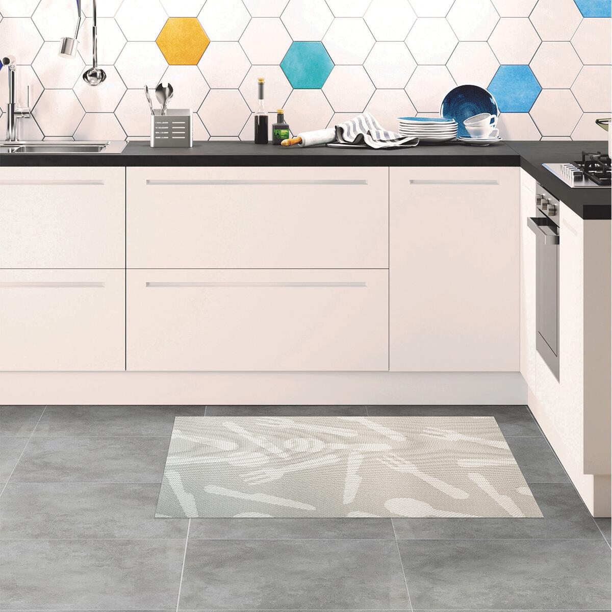 Tappeto Industry: Tappeto tessuto in textilene con fondo in 100% PVC antiscivolo, con bordo termosaldato, mis. 50x75 cm. Resistente, realizzato in materiale sintetico, con antiscivolo in PVC e con bordo termosaldato. Ideale per una cucina moderna e industriale. Facile da pulire, le macchie possono essere rimosse semplicemente con una spugna o un panno umido