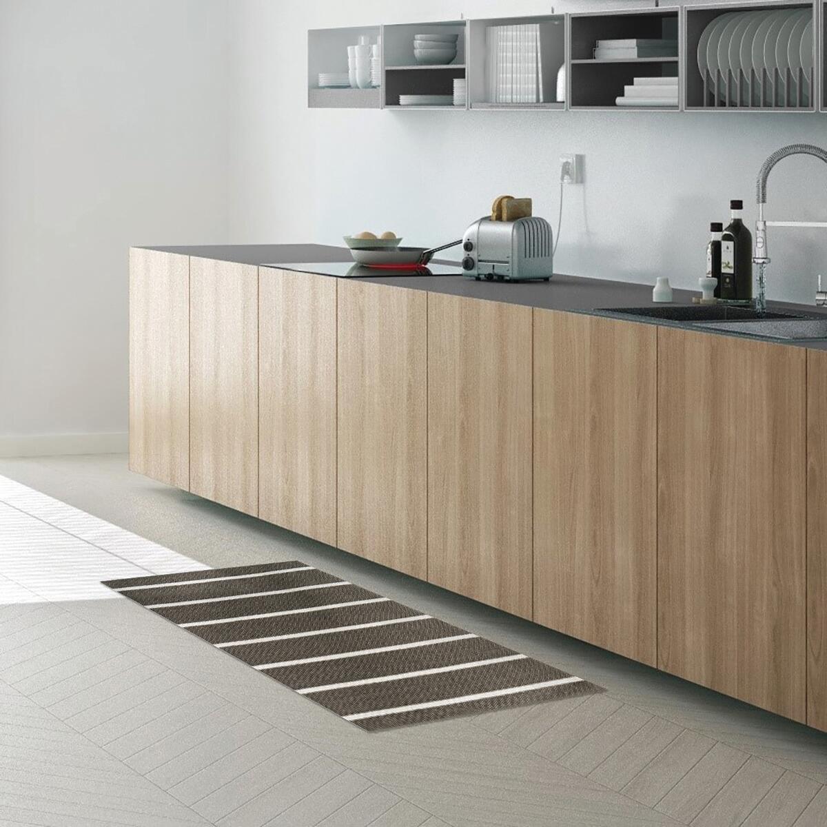Tappeto stampato in 100% cotone, con fondo in dot lattice antiscivolo, disponibile in 6 formati. Tappeto Rigato: Tappeto ideale per una cucina vintage e shabby chic. Resistente e funzionale, realizzato in cotone naturale, il dorso antiscivolo tiene fermo il tappeto, riducendo il rischio di scivolare.. Ideale per una cucina vintage e shabby chic. Facilmente lavabile a mano o in lavatrice a 30°