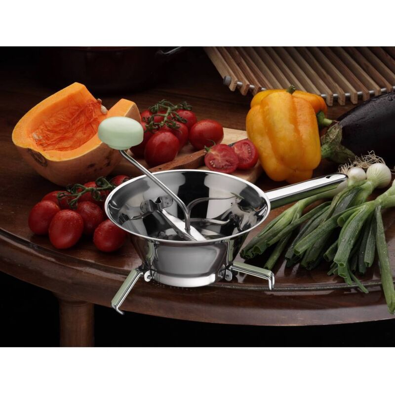 Realizzato in acciaio inox 18/10. In questa versione dispone di due piedini fissi per il posizionamento su recipienti di diversa capienza. Dimensione 20 cm, con tre dischi in acciaio inox con fori differenziati.