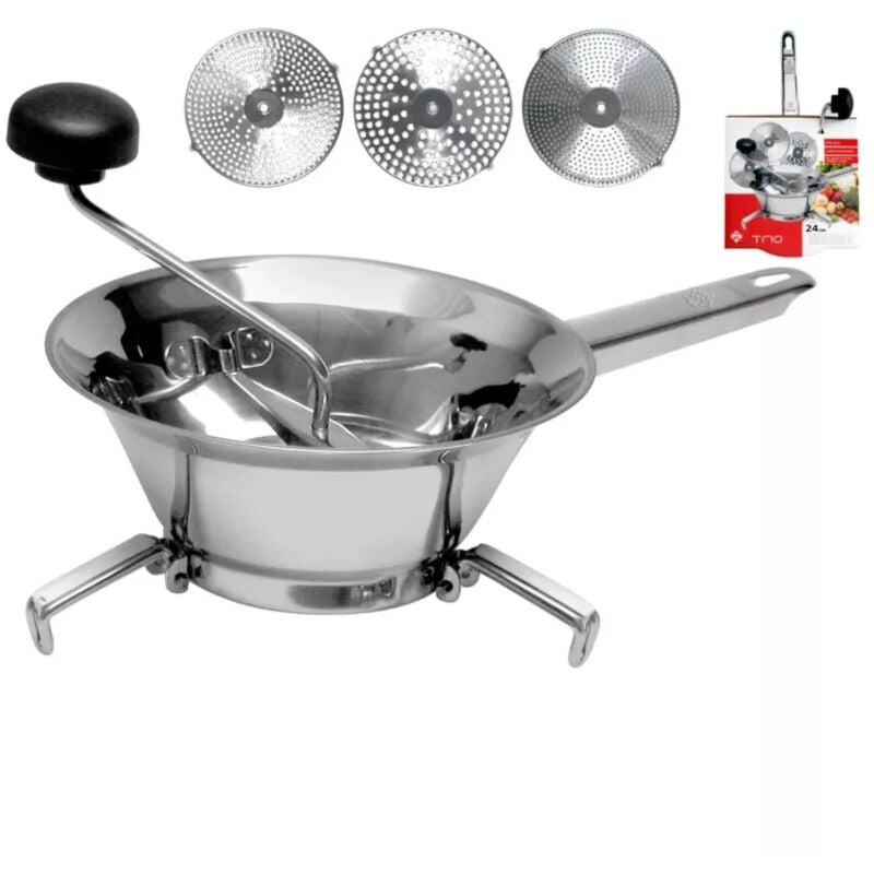 Passaverdure "Rondo" in acciaio inox 18/10 con manico. Passaverdura fornito con 3 dischi intercambiabili con fori di diversa misura. Diametro 24 cm. Lavabile in lavastoviglie. Caratteristiche del prodotto Specifico per Passaverdure/spremipomodoro Dimiensioni prodotto Larghezza: 0.0 m. Altezza: 0.0 m. Profondit: 0.0 cm. Peso: 2.5 Kg. Dimensioni Imballo Larghezza: 0.0 cm.
