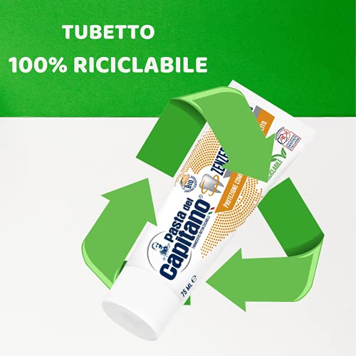 RISPETTO DELL'AMBIENTE - Pasta del Capitano, da sempre sinonimo di sicurezza e qualità Made in Italy, da oggi propone prodotti più ecosostenibili: il nuovo tubetto è in PBL, realizzato in plastica senza allumino, quindi completamente riciclabile. Una soluzione di pack che rispetta l'ambiente, con formulazioni specifiche per rispondere alle diverse esigenze in ambito di igiene orale. Pasta del Capitano protegge il tuo sorriso e protegge il nostro Ambiente!
