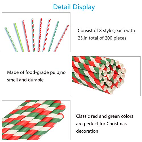 La confezione include:200 PCS Cannucce di carta colorato,otto disegni,ogni 25.Diversi colori,bianco,rosso e verde,possono dare al tuo primavera un'atmosfera festosa.