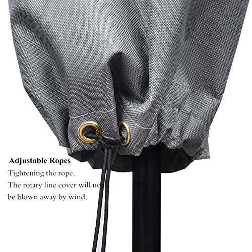 Resistente al vento: ci sono corde regolabili sul fondo. Mettere il coperchio sulla linea di lavaggio rotante, quindi stringere la corda. (legare un nodo e sarà più forte) La copertura rotativa non sarà spazzata via dal vento.