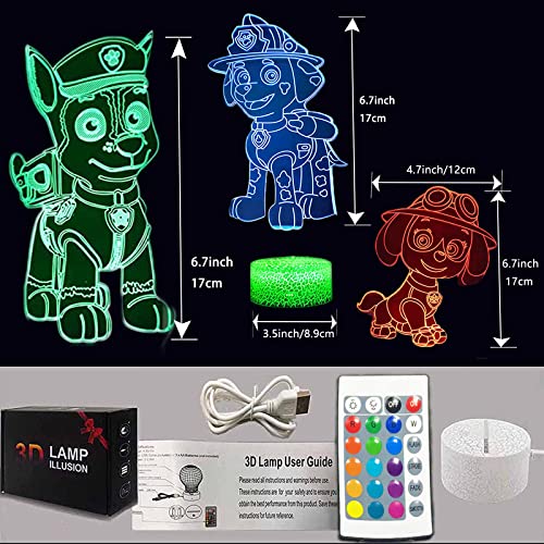 Paw Dog Patrol Luce Notturna per Bambini, 3 Pezzi 3D LED Illusion Lampada 16 Cambia Colore Giocattolo Dimmerabile per Ragazzi Regali di Natale di Compleanno