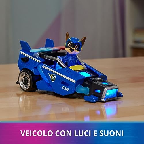 PERSONAGGI PAW PATROL DA COLLEZIONE: Con l'uniforme originale di Paw Patrol: Il Super Film, il personaggio di Chase è unico nel suo genere. L'uniforme traslucida si illumina quando Chase è a bordo del suo veicolo