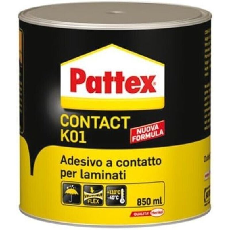 Pattex Contaxt K01 L'adesivo colla universale da 850ml per plastica, legno, gomma e sughero. Adesivo policloroprenico a contatto indicato per laminati plastici decorativi su legno, compensato, truciolare e lamiera. Ideale anche per l'incollaggio di gomma, sughero, linoleum, finte pelli telate, materie plastiche (tranne PE, PP, PTFE).