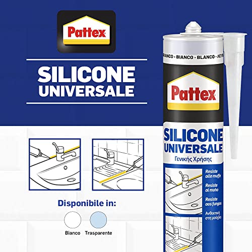 Contenuto - PATTEX Silicone Universale Silicone acetico Bianco, silicone infissi, sanitari, vetrate e grondaie, Multimateriale e resistente a muffa, raggi UV e detergenti, 1 Cartuccia da 280 ml