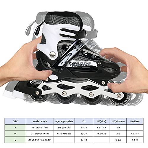 Pattini in linea regolabili: i nostri pattini in linea regolabili sono disponibili in 3 taglie: S, M, L. Man mano che i piedi del bambino crescono, un paio di stivali possono essere regolati in diverse dimensioni. Quando i piedi del bambino crescono, i pattini a rotelle possono ancora essere indossati. Si prega di controllare la nostra tabella delle taglie e scegliere la taglia giusta per il vostro bambino.
