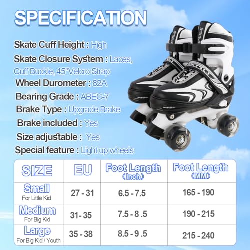 Pattini a rotelle regolabili per ragazzi, ragazze, bambini, principianti, pattini a rotelle di 4 dimensioni regolabili per bambini, ragazzi e bambini con ruote illuminate (Medium, Nero Bianco)