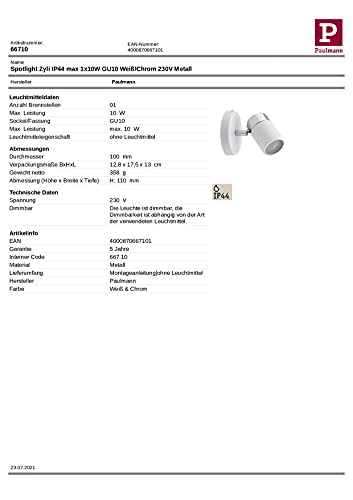 Paulmann 66710 Plafoniera Lampada Soffitto Led Lampada Faretto da Soffitto Spotlight Zyli Ip44 Max 1 x W Gu10 230 V In Metallo Bianco/Cromato