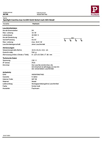 Paulmann 66746 Proiettore Carolina Spot Senza Lampadina Lampada per soffitto Max. 4x10 Watt Nichel Opaco Metallo GU10