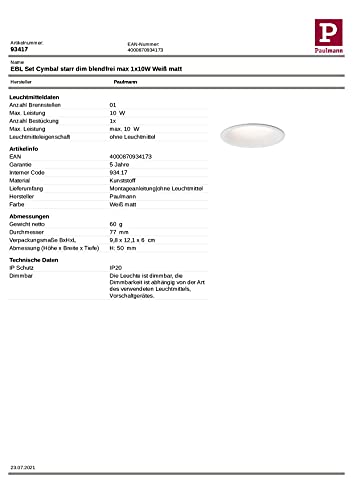 Paulmann 93417 Lampada LED Cymbal faretto dimmerabile da Max. 10 Watt IP44 Bianco Opaco Spot plastica apparecchio da Incasso