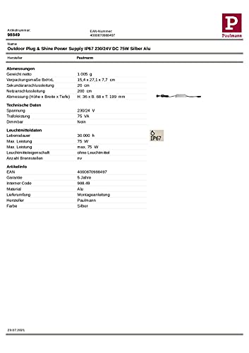 Paulmann 98849 Outdoor Plug & Shine Ip44 230/24 V Dc Bianco Plastica 988.49 Trasformatore Esterno Luci Power Supply, Plastica, 75 W, 18.6 x 6.4 x 4 cm
