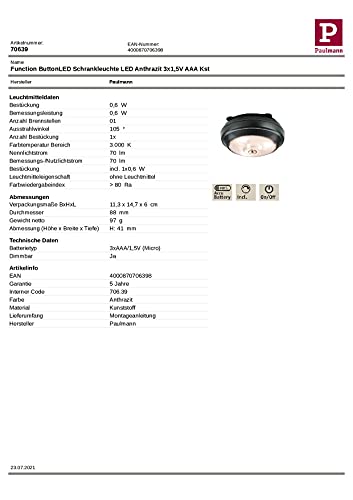 Paulmann ButtonLED 70639 Lampada per mobili LED Button incl. 1x0,6 Watt dimmerabile Antracite Luce per armadi plastica 3000 K Integriert, 0.6 W