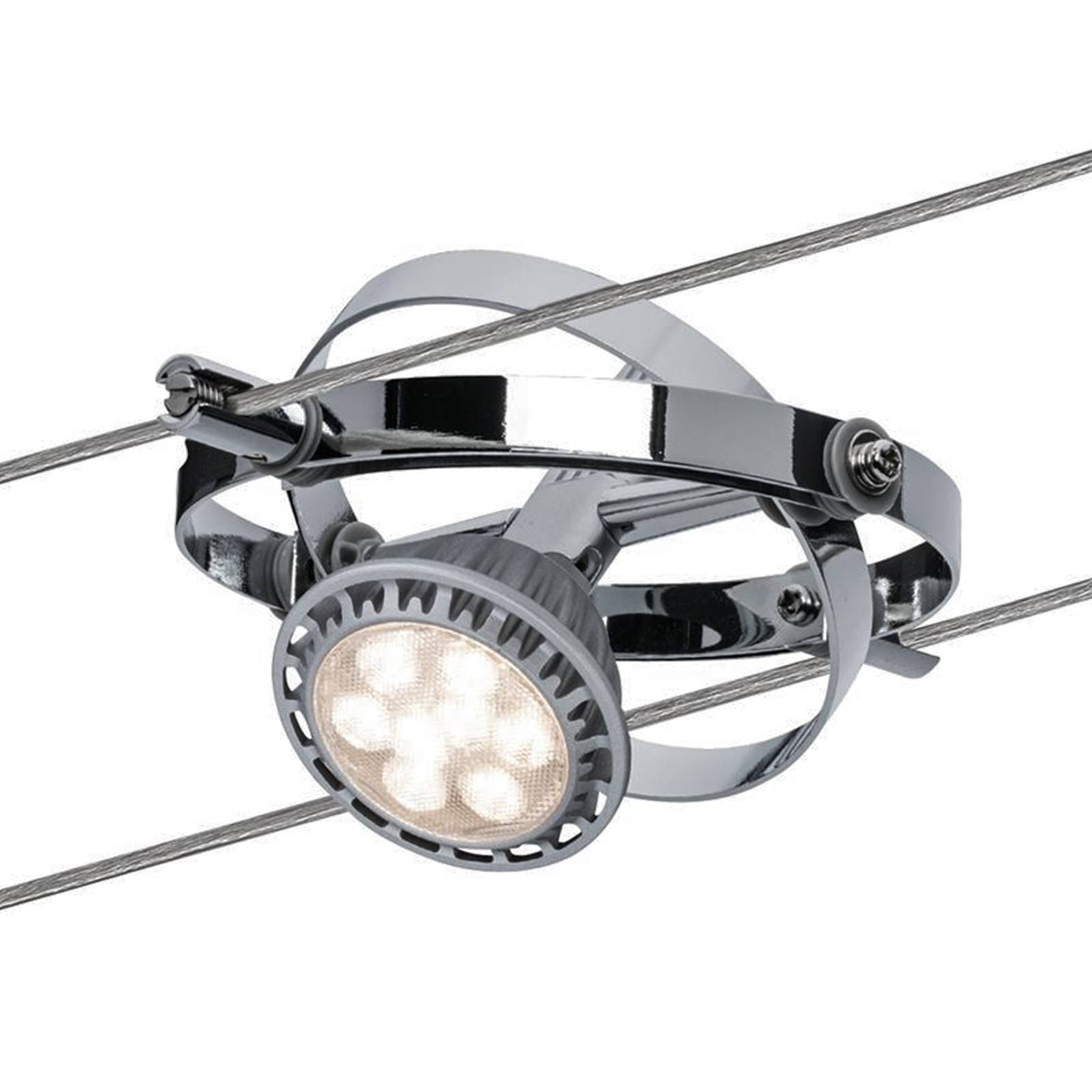 Sistema a filo cardanico come set di base con quattro apparecchi, filo e trasformatore Il sistema a quattro lampade con filo cardanico è fornito pronto per il collegamento con trasformatore, filo e quattro apparecchi. Le lampade nelle quattro prese sono circondate ciascuna da due stretti anelli di metallo, per cui l'anello orizzontale può essere ruotato di 30° e quello verticale di 355°. Il materiale di montaggio, con il quale il sistema di cavi può essere montato sia a soffitto che a parete, è incluso nella fornitura, le lampade (GU 5,3 max. 10 W) non sono incluse.