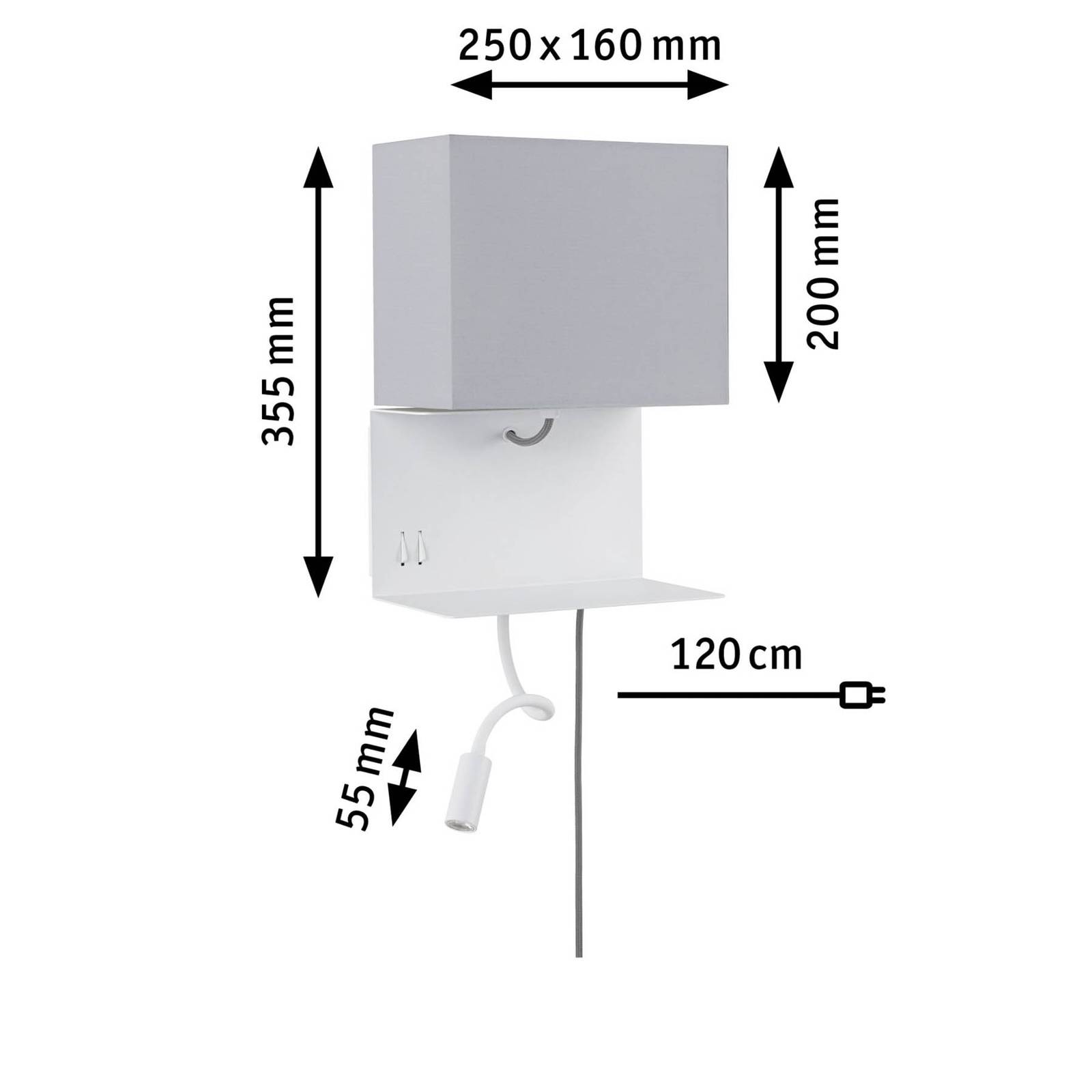 Lampada da parete Merani - grazie al braccio flessibile e al ripiano è perfettamente adatta come lampada da lettura La lampada da parete Merani è un pratico compagno predestinato all'uso in camera da letto. Dotato di un ripiano in metallo laccato bianco, sostituisce il comodino e si integra nella stanza per risparmiare spazio. Un braccio flessibile è fissato al ripiano, che è dotato di una sorgente luminosa a LED da 2,5 W installata in modo permanente e fornisce 120 lumen in luce bianca calda. La sorgente luminosa a LED ha un'apertura del fascio di 23° e può essere allineata a piacere per ottenere un'illuminazione ottimale durante la lettura nelle ore serali. Come ulteriore extra, sul lato dello scaffale è integrata una porta USB, che può essere utilizzata per ricaricare comodamente lo smartphone durante la notte. Inoltre, sul supporto a parete sono presenti due interruttori che possono essere utilizzati per commutare separatamente la sorgente luminosa E27 o i LED nel braccio flessibile. La lampada E27 è circondata da un paralume quadrato in tessuto, aperto in alto e in basso. Fornisce una luce indiretta e non abbagliante che immerge l'ambiente in un'atmosfera accogliente. La lampada da parete è dotata di un cavo tessile staccabile con spina, in modo che una presa sia sufficiente per il collegamento.