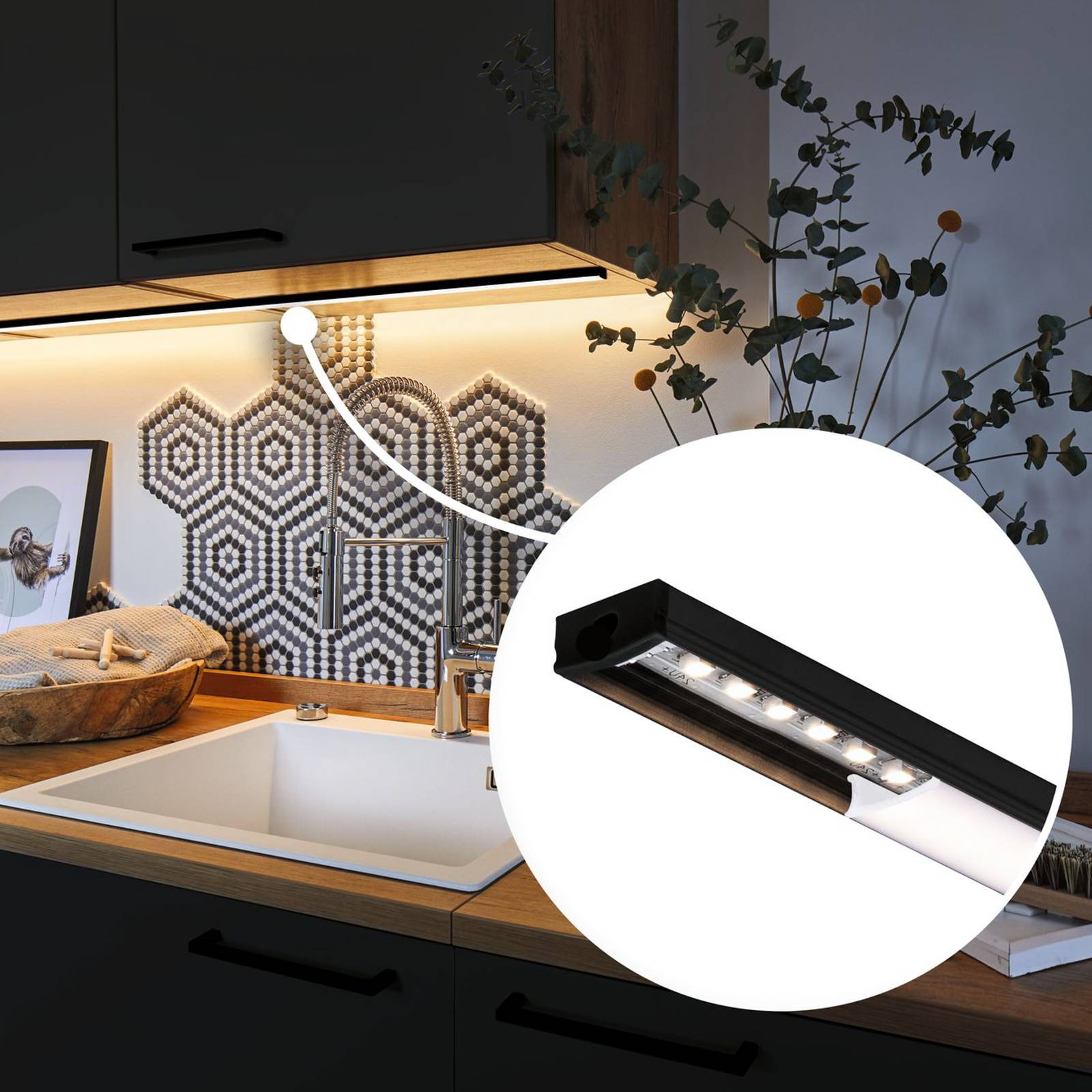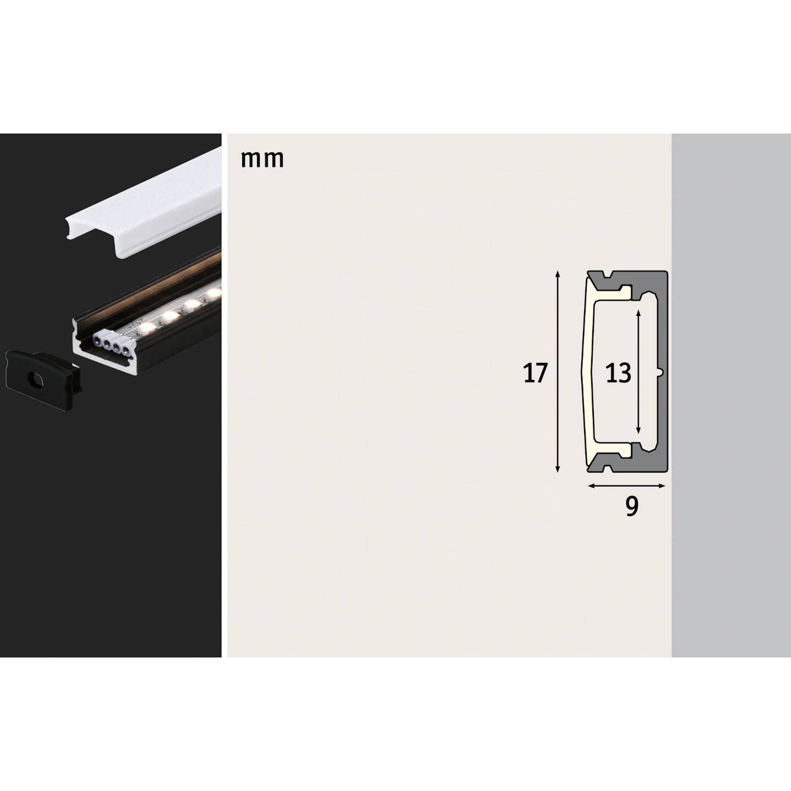 Profilo nero in superficie Base con diffusore satinato per striscia LED MaxLED Questo profilo in alluminio fornisce un'illuminazione ambientale omogenea su mobili o pareti. Può essere dotato di una striscia LED MaxLED e offre un'emissione di luce particolarmente uniforme grazie al diffusore in plastica satinata. Il robusto profilo in alluminio è laccato in nero opaco. - Il profilo può essere accorciato individualmente - Compatibile con la striscia MaxLED 1000 LED