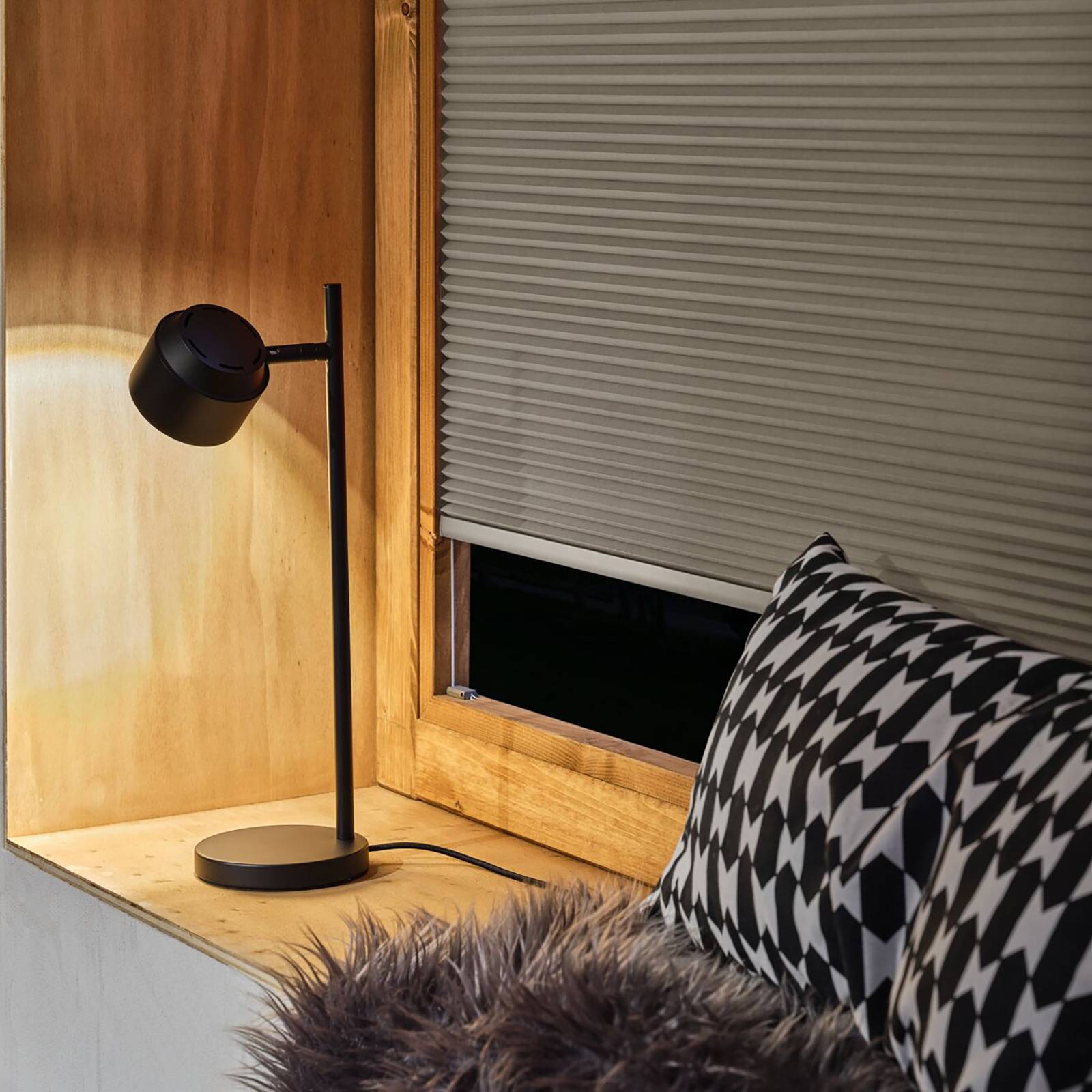 Lampada da tavolo Puric Pane LED con spot orientabile La lampada da tavolo Puric Pane LED nera, dal design discreto ma moderno, è dotata di una moderna tecnologia LED e di un modulo ZigBee. Può quindi essere integrato in qualsiasi sistema domestico intelligente con un'interfaccia ZigBee 3.0 e può essere controllato tramite comando vocale o app, a seconda del sistema e dell'apparecchiatura. La lampada da tavolo Puric Pane LED emette una luce bianca calda che viene efficacemente indirizzata dalla lente sfaccettata nello spot con un effetto luminoso molto bello. L'apparecchio è dotato di un cavo rivestito in tessuto con alimentazione a spina ed è ideale sia per la scrivania che come luce da lettura in salotto.