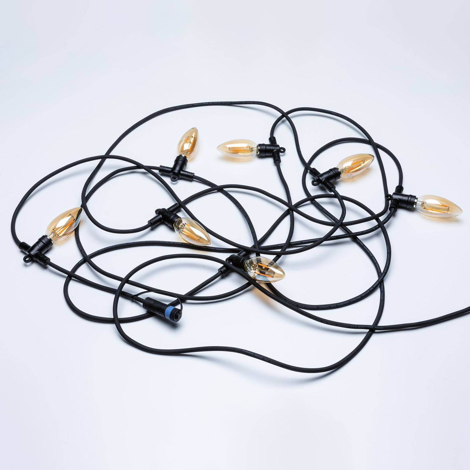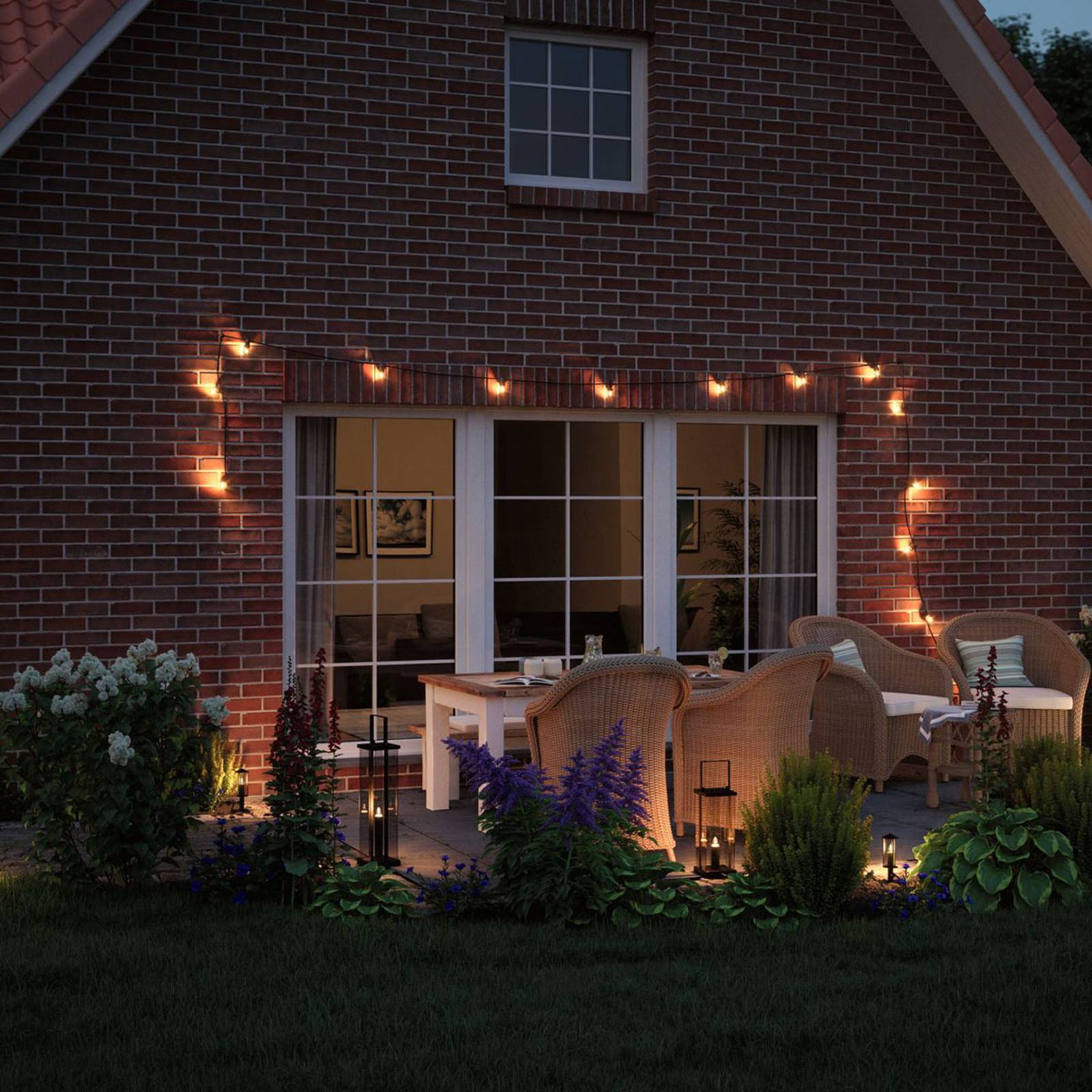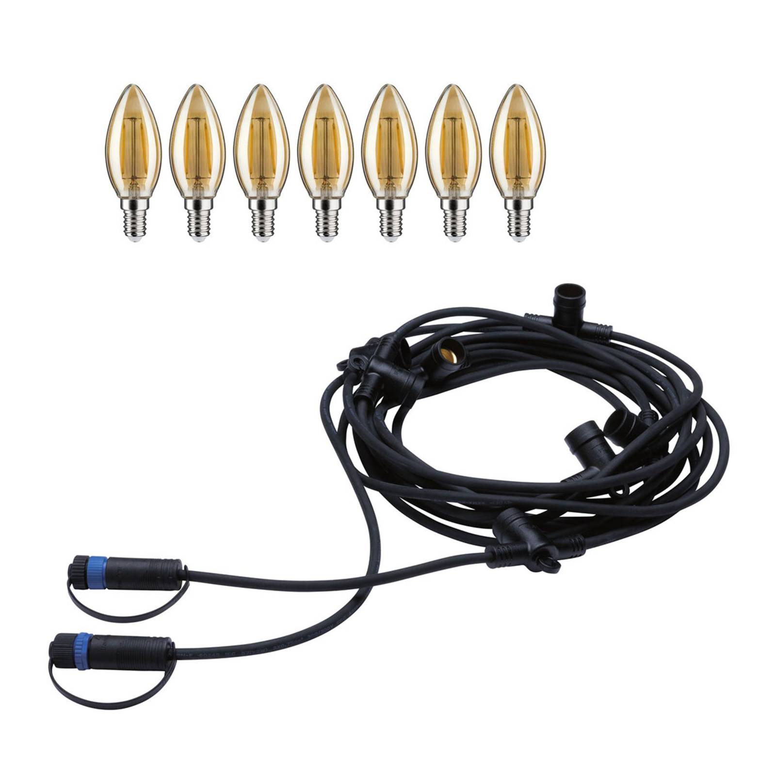 Plug & Shine Catena luminosa Classic con sette lampade a candela a filamento La catena luminosa Classic a 7 luci con cavo in plastica nera è utilizzata per decorare in modo flessibile l'illuminazione esterna con il sistema Plug & Shine. Con il loro aspetto a filamento, il vetro color oro e la luce particolarmente calda, le lampade a candela favoriscono un'atmosfera rilassata e suggestiva. Grazie agli occhielli sul retro dei portalampada, possono essere fissate in un attimo al soffitto di un gazebo, alla ringhiera di una veranda o a una pergola. Poiché la ghirlanda luminosa ha anche un'uscita oltre all'ingresso, è possibile aggiungere facilmente altre unità o altre luci (tenere presente la potenza totale quando si sceglie il trasformatore) - Con una tensione di esercizio di 24 V e cavi, collegamenti e luci protetti dall'acqua, Plug & Shine di Paulmann è una soluzione di illuminazione versatile e sicura per le aree esterne. - I trasformatori con spina sono disponibili tra gli accessori - Può essere sempre accesa e spenta tramite l'interruttore della luce - Per il telecomando è necessario un controller (vedere accessori) - Plug & Shine è integrabile in Smart Friends per il controllo tramite l'app Smart Friends (per iOS e Android). A tale scopo è necessario un controller ZigBee (vedere gli accessori). Plug & Shine può essere integrato anche in altri sistemi smart home ZigBee-compatibili (ad esempio per il controllo vocale tramite Amazon Alexa), per i quali è necessario il relativo gateway - lunghezza massima del cavo sorgente di alimentazione - apparecchio: 50 m - resistente all'acqua della piscina