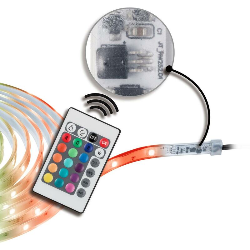 Striscia a led semplificata Outdoor Basest - 3M IP44 8.5W 24LEDS / M RGB Il set completo di esterno trasparente da esterno con una lunghezza di 3 metri crea una luce decorativa intorno al casa. Sia al posto auto coperto, sulla terrazza o sotto il supernatante del tetto, le strisce creano una piacevole luce indiretta. Il set completo è incl. Transformer Plug immediatamente Plug & Play pronto per l'uso. Grazie alla tecnologia RGB, il colore può essere impostato individualmente tramite telecomando. L'effetto memoria integrato memorizza l'ultima impostazione del colore quando si spegne. La dimensione minima dei componenti attraverso il ricevitore integrata nella striscia, facilita l'installazione. Il rivestimento fornisce protezione contro polvere e spruzzi d'acqua. Protezione IP: IP44 - PROVA SPLASSCH Cambia colore RGB Set pronto pronto incluso alimentatore da 230 / 24V con supplente e spina di alimentazione materiale flessibile per il montaggio su substrati piatti o curvi Sistema