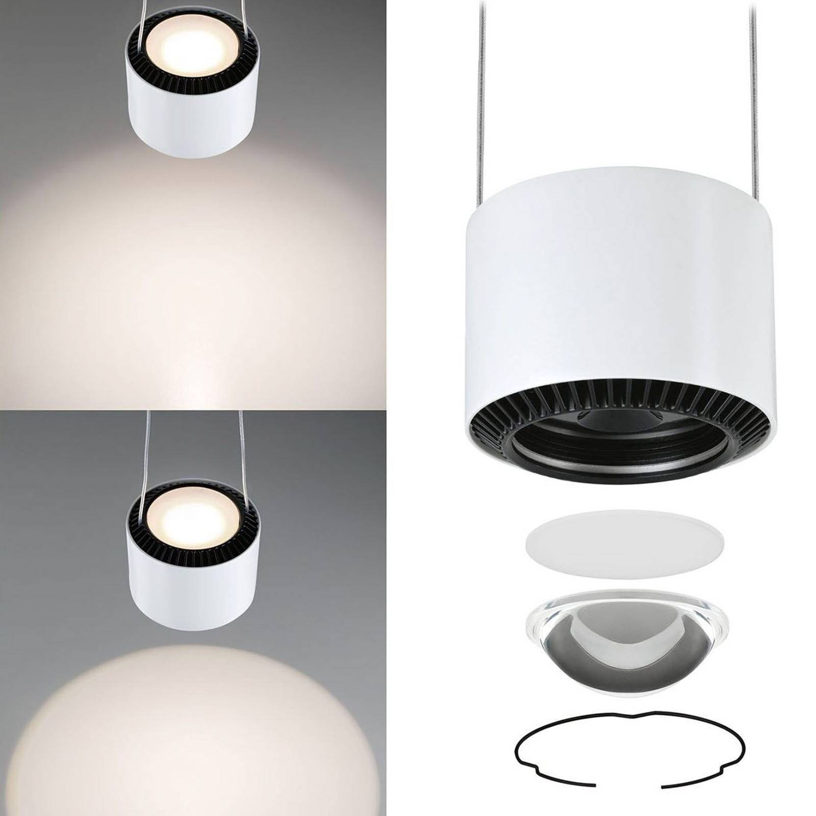 Elegante sospensione a LED Aldan per completare il sistema a binario URail La sospensione Aldan LED è intesa come un componente moderno per il sistema di binari URail e può essere utilizzata solo in combinazione con esso. Ha un corpo dell'apparecchio rotondo e accattivante da cui emerge una lente nella parte inferiore. I LED bianchi caldi sono installati dietro questa lente ed emettono una luce diretta verso il basso. Per l'illuminazione d'accento, la luce viene anche emessa indirettamente verso l'alto e illumina delicatamente l'ambiente circostante. Il ciondolo può essere regolato in altezza da 150 cm a un minimo di 20 cm a seconda delle necessità. Inoltre, la lampada può essere dimmerata con vari dimmer convenzionali (con dimmer R, L, C).