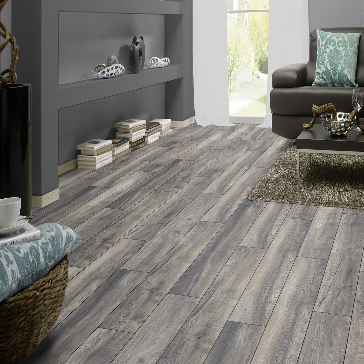 Pavimento laminato in HDF, colore grigio. Rendere più moderna la casa con un pavimento facile da posare e che permetta, in caso di usura o di problemi su alcune doghe, di poterle sostituire. Non richiede trattamenti di lucidatura, ceratura o levigatura. Il pavimento si adatta ad essere smontato, sostituito o riutilizzato, senza rovinare la vecchia superficie