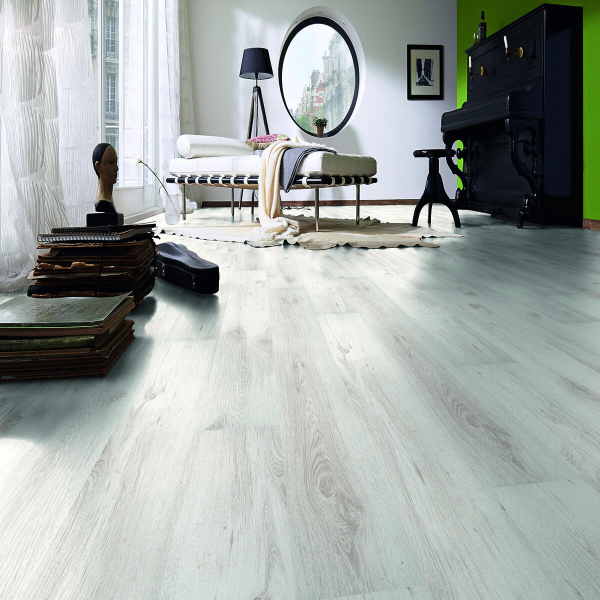 Pavimento laminato in HDF, colore ghiaccio. Rendere più moderna la casa con un pavimento facile da posare e che permetta, in caso di usura o di problemi su alcune doghe, di poterle sostituire. Non richiede trattamenti di lucidatura, ceratura o levigatura. Il colore non può sbiadire nel tempo perchè è composto da lavorazioni che impediscono le alterazioni di tono. Il pavimento si adatta ad essere smontato, sostituito o riutilizzato, senza rovinare la vecchia superficie