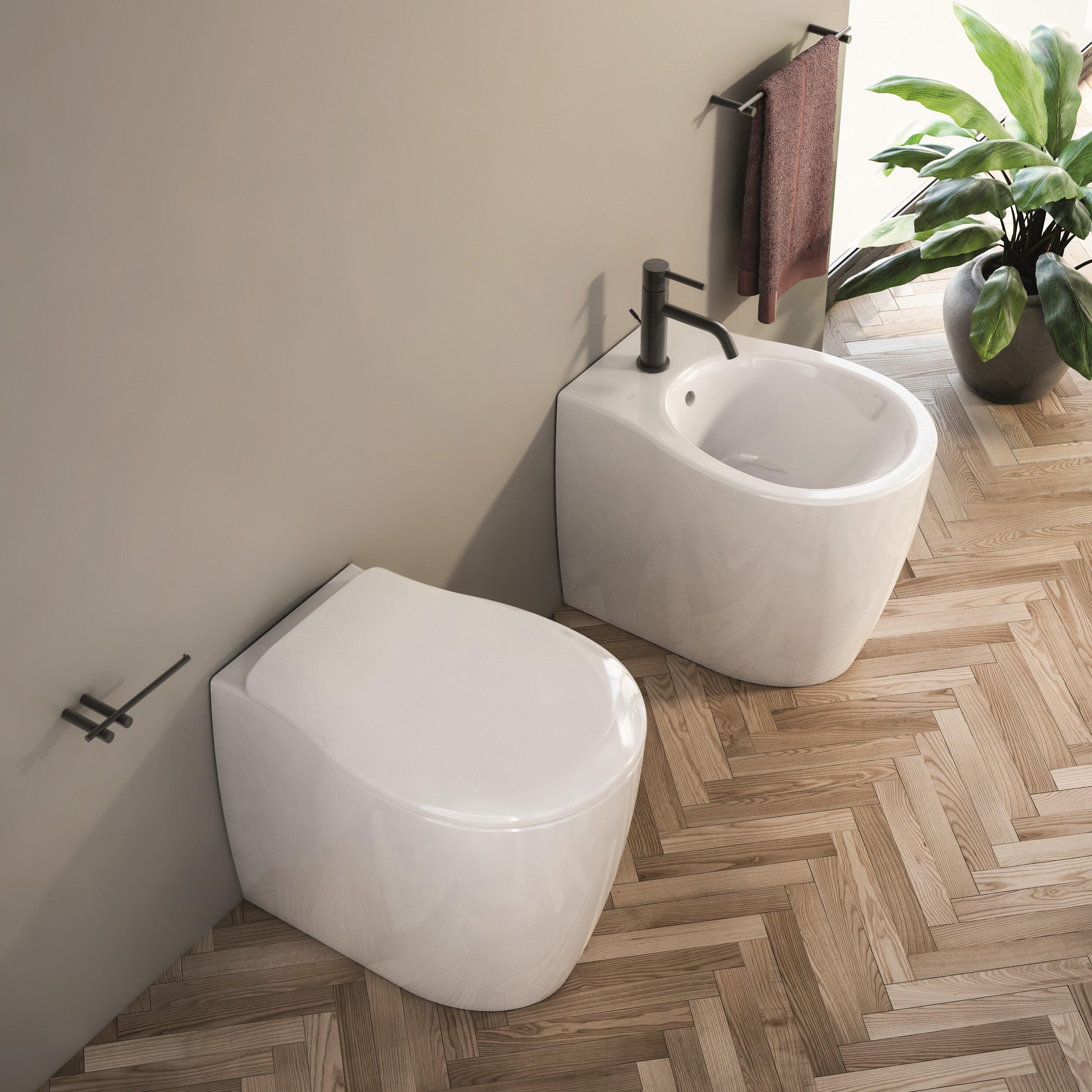 Vaso Soft filo muro s/brida con scarico traslatocon copriwater slim rallentato incluso.. Vaso senza brida che garantisce un maggiore igiene ed una facilita' di pulizia.. Risparmo idrico. Garantita la pulizia del sanitario con 3 litri per I liquidi e 4,5 con I solidi.. Silenziosita' dello scarico.