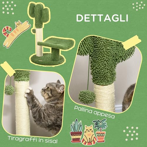PawHut Albero per Gatti a forma di Cactus con Tiragraffi, Pallina da Gioco e Piattaforma, Torre per Gatti in Truciolato e Ciniglia, 35x31x55.5 cm, Verde e Bianco
