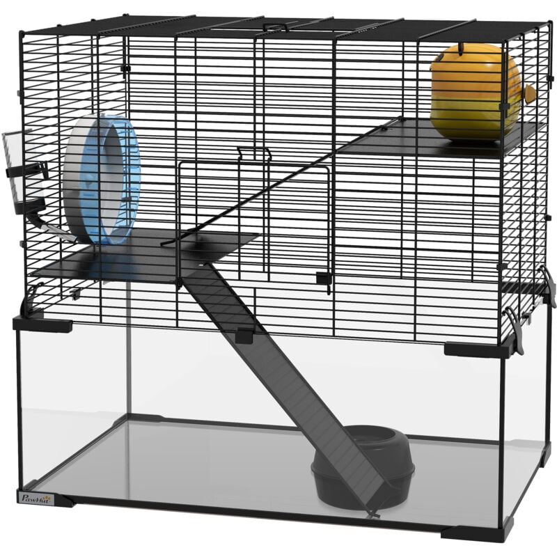 Descrizione: La gabbia per criceti nani PawHut garantisce un habitat sicuro e stimolante. Dotata di rampe, piattaforme e ruota per esercizi, questa casetta per criceti stimola il tuo animali e restare attivo. Include una ciotola per il cibo e bottiglia d'acqua per assicurargli tutto l'indispensabile. La gabbietta per criceti offre un accesso semplice dalla porta frontale e una pulizia facile grazie al fondo removibile. La struttura in fili d'acciaio assicura ventilazione e freschezza. Caratteristiche: ● Casetta per criceti a 3 livelli per offrire tanto spazio ● Include una ruota da corsa, una casetta, una bottiglia d'acqua, una ciotola per il cibo, rampe e piattaforme ● Il filo d'acciaio non pizzica ● La porta frontale offre un facile accesso alla gabbia per criceti ● Il fondo rimovibile facilita la pulizia e contiene più lettiera ● Adatto per piccoli animali, come criceti e gerbilli (si prega di verificare se gli animali possono essere messi insieme prima dell'acquisto) ● Facile da