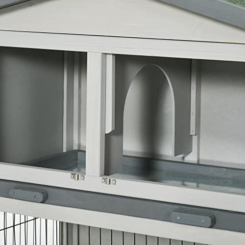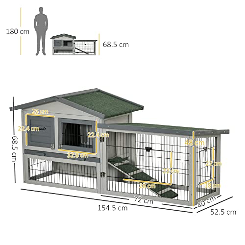 PawHut Conigliera a 2 Livelli in Legno per Esterni con Tetto Apribile, Gabbia per Conigli con Vassoio Estraibile e Rampa, 154.5x52.5x68.5cm, Grigio