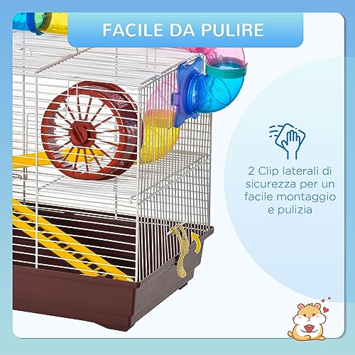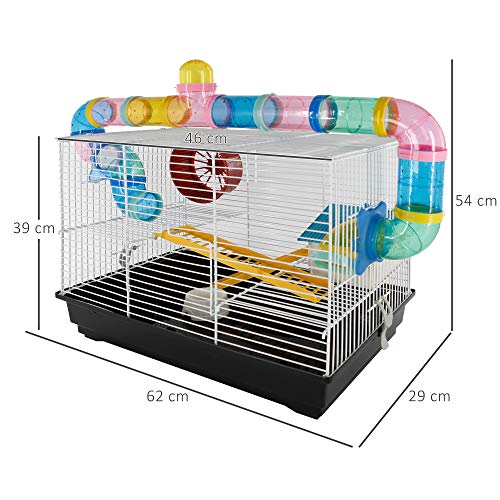 PawHut Gabbia per Criceti a Tre Piani con Tubi, Casetta, Ruota e Accessori, in Metallo e Plastica 62x29x52cm