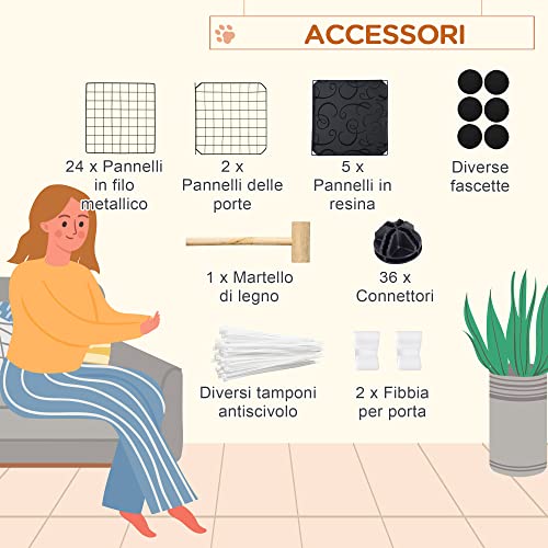 ACCESSORI INCLUSI: Il recinto per animali è dotato di 24 pannelli in metallo, 2 pannelli con porticina, 36 connettori standard e 2 fermi per la porta. Include fascette e un martelletto in legno che puoi usare per installare il box senza nessuno sforzo.