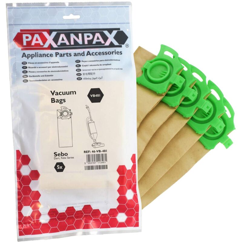 Descrizione Paxanpax Confezione da 5 sacchetti di carta compatibili VB481. Compatibile con aspirapolvere Sebo Dart & Felix. Progettato per avere una lunga durata e soddisfare o superare le specifiche del produttore originale. Codice prodotto Paxanpax VB481. Riferimento commerciale equivalente: 7029ERC. Prodotto Paxanpax di qualità: ricambi di alta qualità per il tuo aspirapolvere.