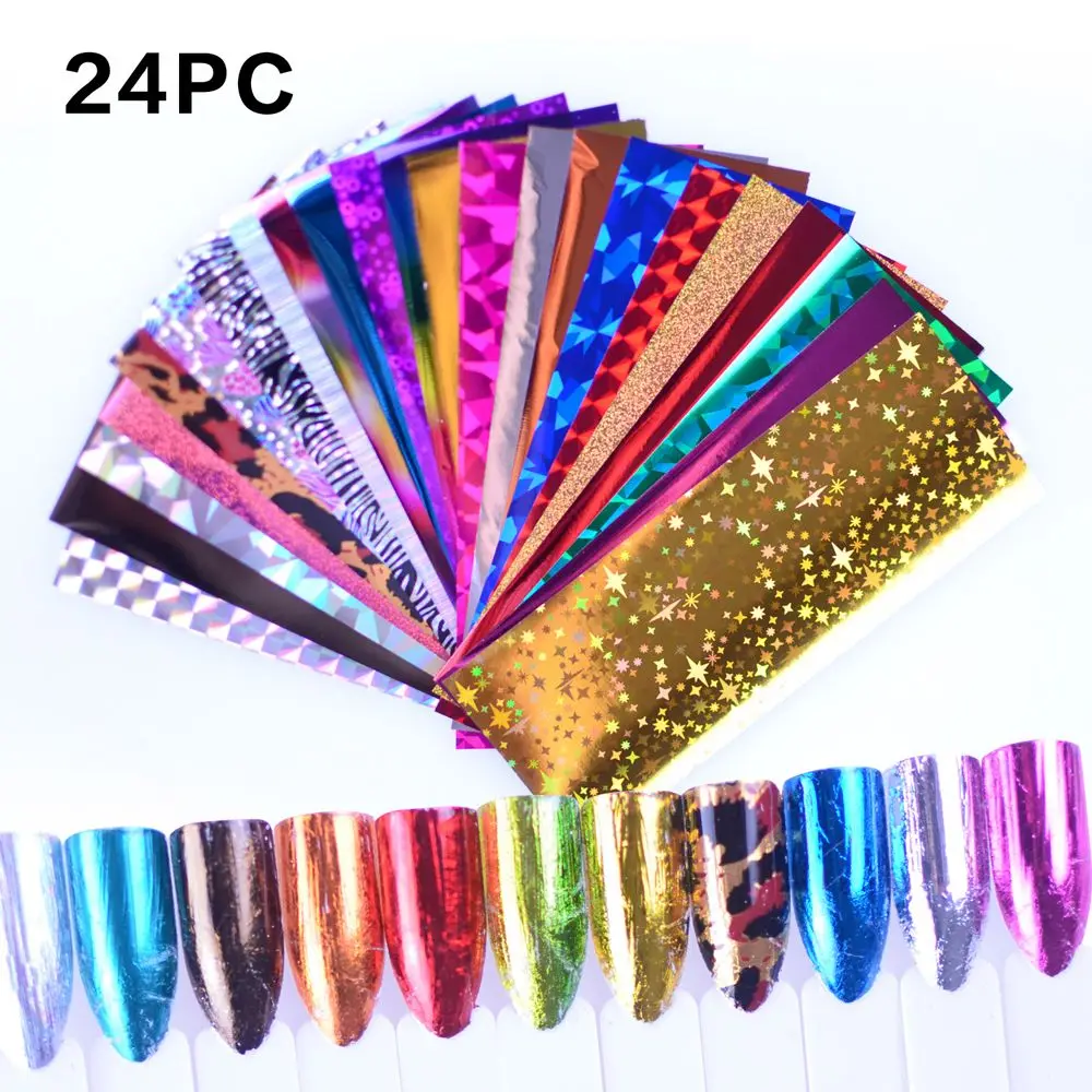 24 Pcs/set Colorful Starry Foil Nail Decals Nail Art Stickers Holographic Laser Glossy DIY Transfer Nail Decor Manicure Tools