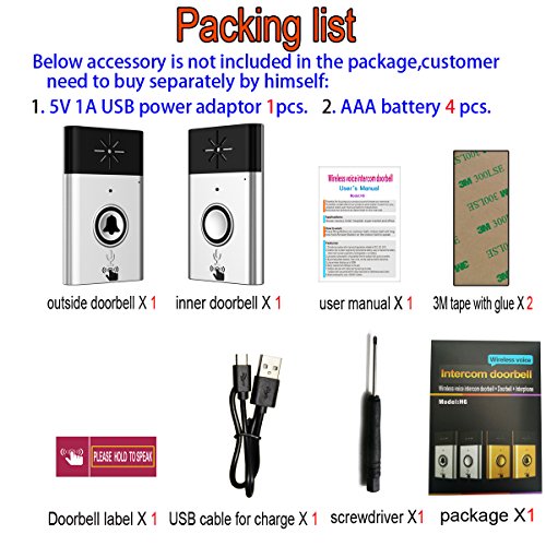 Basso consumo energetico: il campanello esterno è alimentato da 4 batterie alcaline AAA (non incluse), il citofono interno è alimentato da una batteria ricaricabile agli ioni di litio. Basso consumo energetico, lunga autonomia in stand by per il campanello esterno, può durare fino a 6 mesi.