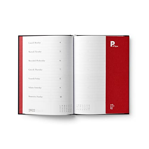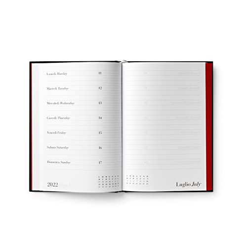 Copertina nera rigida, con bordo rosso, con segnalibro in tessuto . 12 mesi, settimanale .