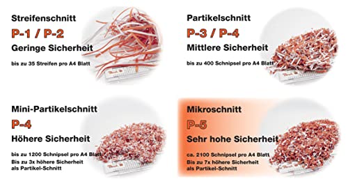 Sicurezza: livello di sicurezza P-5 (secondo DIN 66399). Taglio Micro Cut con particelle di soli 3 x 10 mm. Più di 2100 ritagli per A4. Distruzione di documenti ideale secondo il nuovo regolamento sulla protezione dei dati (DSGVO 2018)