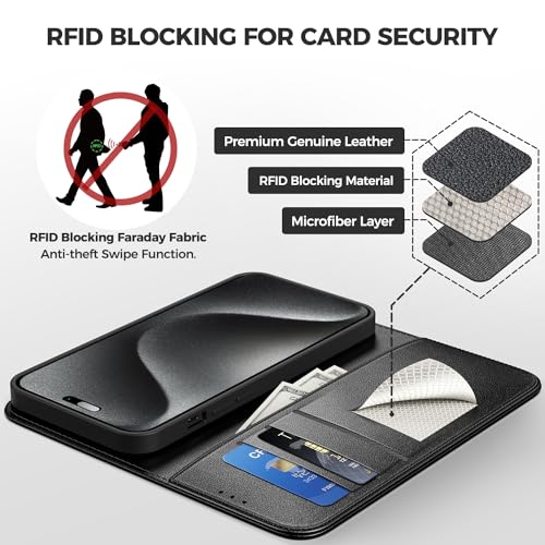 Peakally Custodia per iPhone 15 Pro, Blocco del Segnale RFID, Cover a Libro in Vere Pelle Premium, Custodia a Portafoglio [Slot per Schede] [Funzione di Supporto] [Magnete] - (Nero)