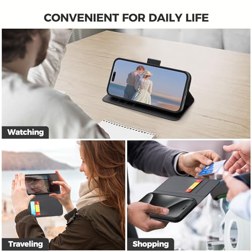 [ Chiusura magnetica e supporto per telefono ] Questa custodia in pelle per telefono è dotata di una fibbia magnetica esterna, che ha una forte funzione magnetica per impedire l'apertura accidentale della custodia del telefono. Il supporto vivavoce ad angolazione regolabile ti consente di posizionare il tuo dispositivo in modalità orizzontale per guardare contenuti multimediali o chat video.