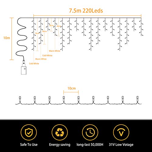 【Luce Bianca Calda + Fredda Unica】Questa tenda LED ha doppia temperature di colore: Bianco caldo e bianco freddo. 7,5M x 0,7M LED light tenda, 220 LEDs, istribuiti su 44 stringhe, lunghezza dei fili da 30 a 70 cm ( pendente più lungo ).