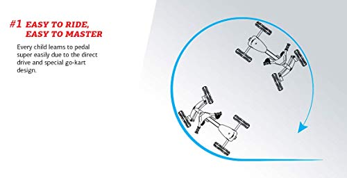 Il Buzzy 2 in 1 può essere utilizzato in due supporti grazie alla ruota libera commutabile. Il bambino può guidare autonomamente come con un normale Buzzy. Nella posizione "push" i pedali sono spenti in modo che il Buzzy possa essere spinto senza che i pedali si muovano. Tra i due supporti può essere facilmente acceso quando l'anello attorno all'asse del pedale viene ruotato a sinistra o a destra.