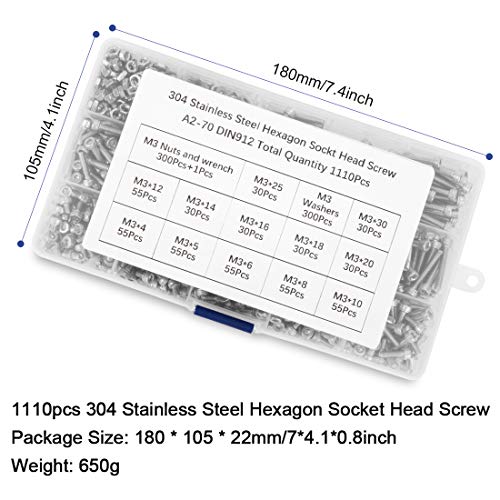 Peinat 1110PCS Kit di Bulloni e Dadi M3 304 Acciaio Inossidabile, viti e dadi, Testa a Brugola Viti, Kit Viti a Brugola in Acciaio Inox Esagonale con Scatola di Stoccaggio
