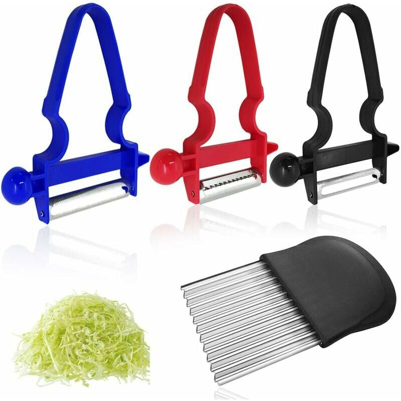 Pelapatate Magic Trio Materiale: manico in ABS + lama in acciaio inossidabile Pelapatate professionale: grattugia cavoli, verdure di diametro maggiore e affetta un blocco con un chilo di formaggio tagliato. Pelapatate standard: sbucciate qualsiasi frutta o verdura e tagliate a mezzo chilo di formaggio e verdure di piccolo diametro. Julienne Peeler: crea una julienne di dimensioni standard per frutta o verdura soda come le carote. Manico per taglierina in plastica Materiale: acciaio inossidabile + plastica Peso: 4,2 once / 117 g Dimensioni: 5,5 * 3,58 pollici / 14*9.1 TRITATRICE MULTIUSO Affettatore curvo per tritare verdure, affettare frutta, patatine fritte, sottaceti, semplice insalata di uova e condimenti insoliti per una bella presentazione di piatti. ALTA QUALITÀ Realizzato con un manico in ABS di alta qualità e una lama in acciaio inossidabile, qualunque sia il compito, il pelapatate dovrebbe affrontare dossi e curve con facilità senza intasare o danneggiare il suo tagliente per