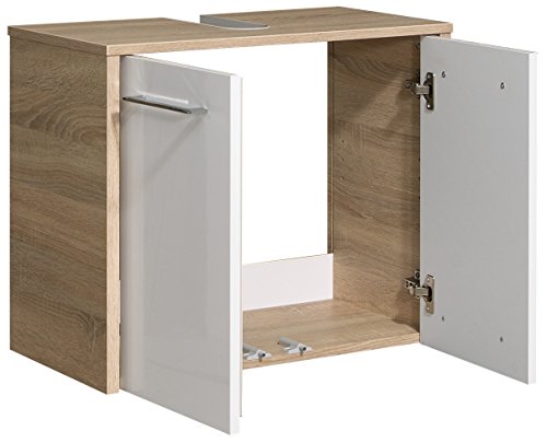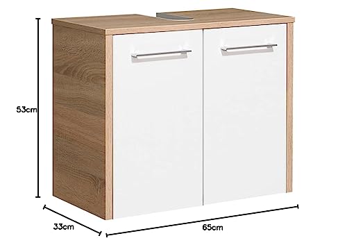 Elegante: questo moderno mobiletto sottolavabo in bianco lucido/rovere naturale è senza dubbio l'attrazione del vostro bagno grazie alle eleganti maniglie cromate lucide