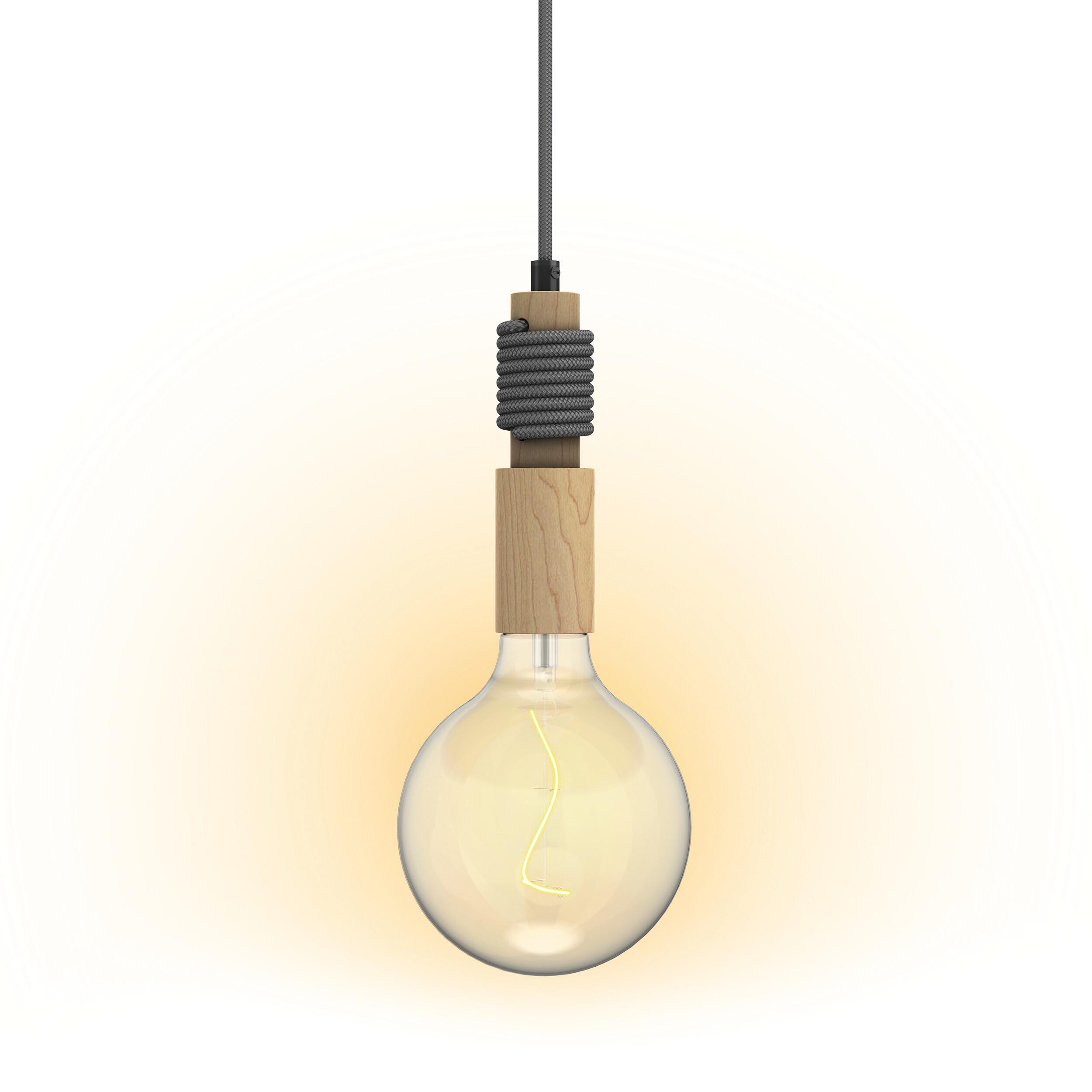 Portalampada cilindrico pendel in legno con finitura in corda in canapa grigia, con cavo da 1,5m grigio, attacco E27, potenza max 60W.